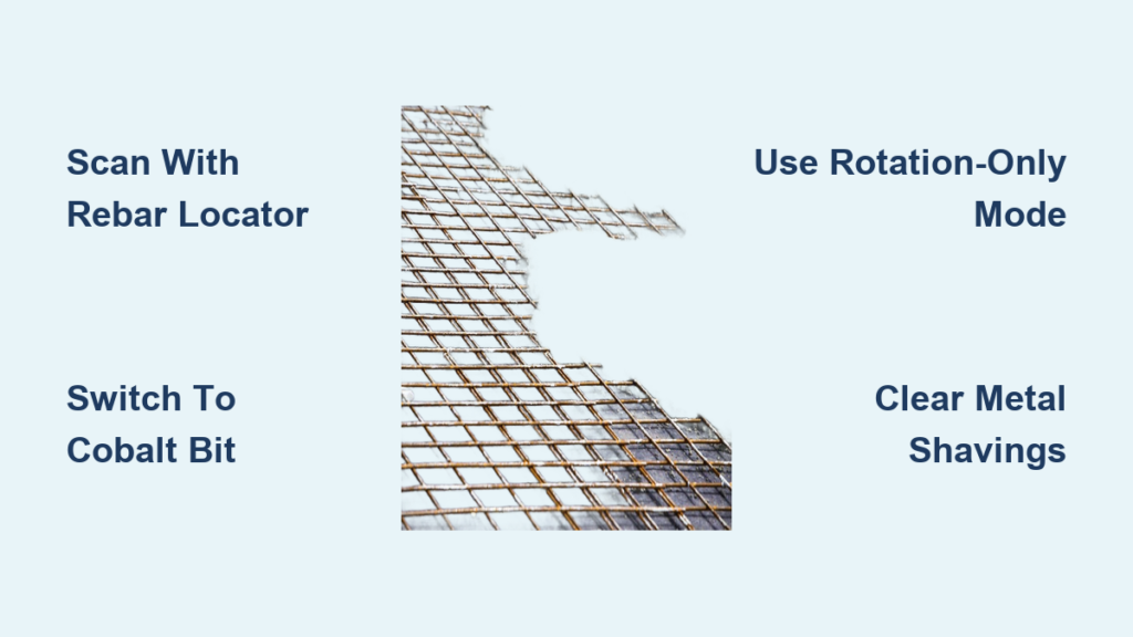 Critical mistake to avoid: Forcing the bit through multiple rebar layers without proper technique. Residential concrete often contains multiple rebar mats spaced 1-2 inches apart—expect to encounter several steel barriers.