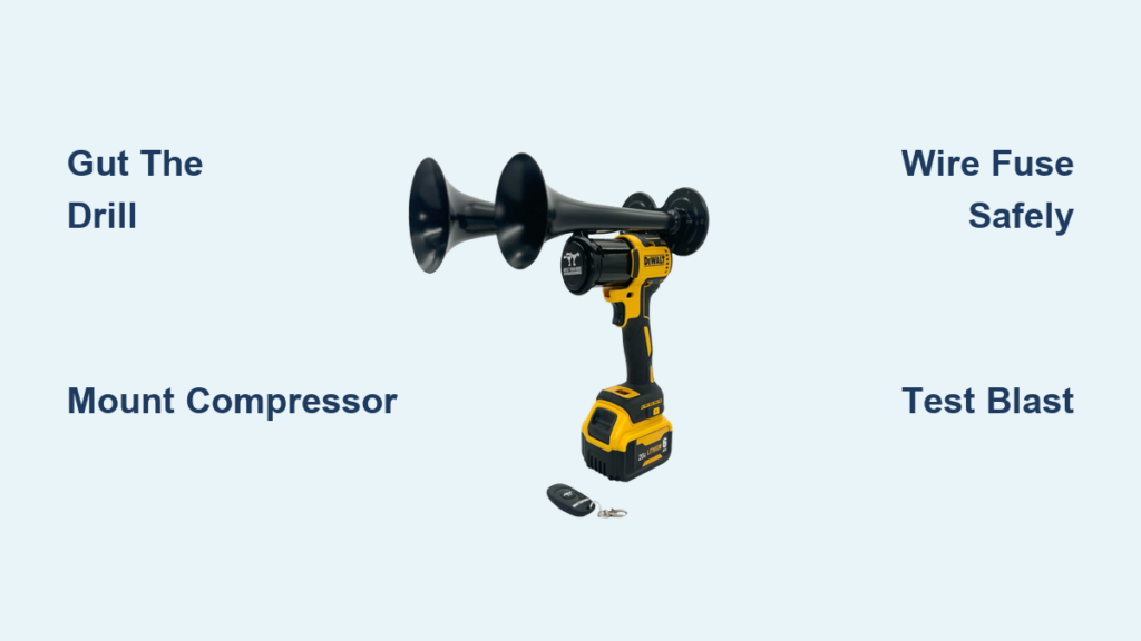 A drill horn isn’t actually a siren—it’s a clever repurposing of your cordless tool’s housing, battery, and trigger mechanism to power a specialized 12V airhorn kit. When you learn how to make a drill horn, you’re essentially converting the drill’s empty shell into a mobile air compressor station. The beauty lies in the existing design: the battery provides instant power, the trigger switch becomes your activation button, and the rugged housing protects delicate components. Unlike bulky commercial airhorns, this version fits in your palm and delivers a 3-second blast at 120-150 dB—the equivalent of a jet engine at takeoff. Crucially, you only need a drill with a functional battery and trigger; the motor can be completely dead. This makes it ideal for tools you’d otherwise recycle, turning e-waste into an incredibly loud utility device.