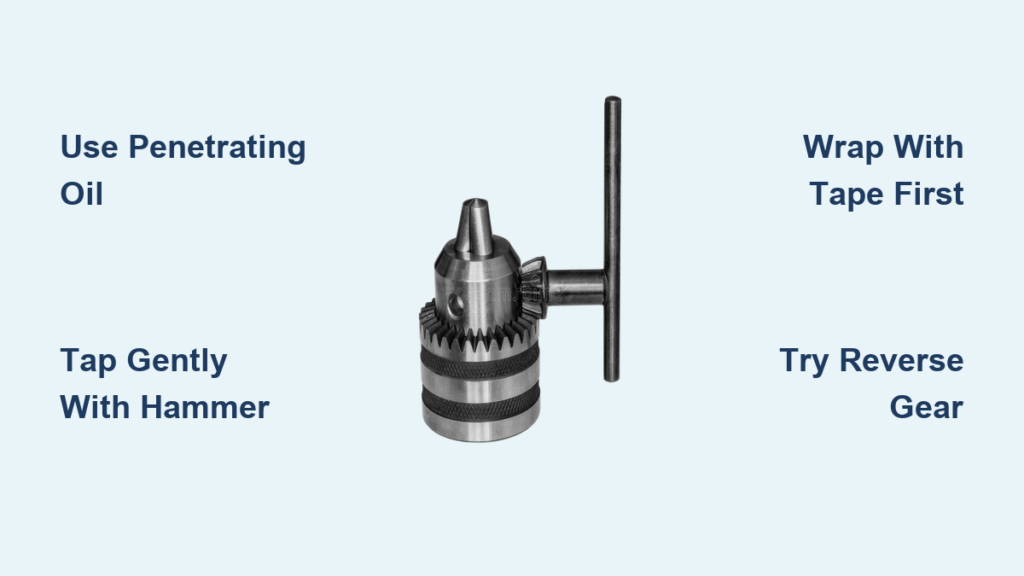 Never yank on a frozen chuck—this cracks housings or strips gears. Start with this low-risk method that resolves 60% of jams. Penetrating oil breaks rust bonds at a microscopic level, while controlled tapping vibrates debris loose. For mild cases, this takes 15 minutes; severe rust may need 24 hours.