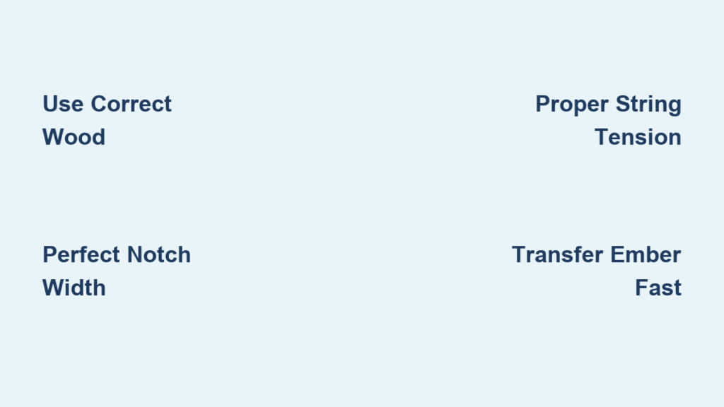 Most beginners waste hours drilling only to produce cold dust because they skip critical material checks. Your spindle and fireboard must be crafted from the same wood species—this compatibility creates the right charred powder consistency. Using mismatched woods (like cedar spindle on basswood fireboard) prevents ember formation entirely. Equally critical is wood dryness: “greenish” or damp wood won’t char properly, no matter your technique. Test by snapping a twig; if it bends instead of cracking cleanly, it’s too moist. Finally, avoid hard woods like oak or maple—they generate minimal dust and excessive heat at the bearing block instead of the fireboard.