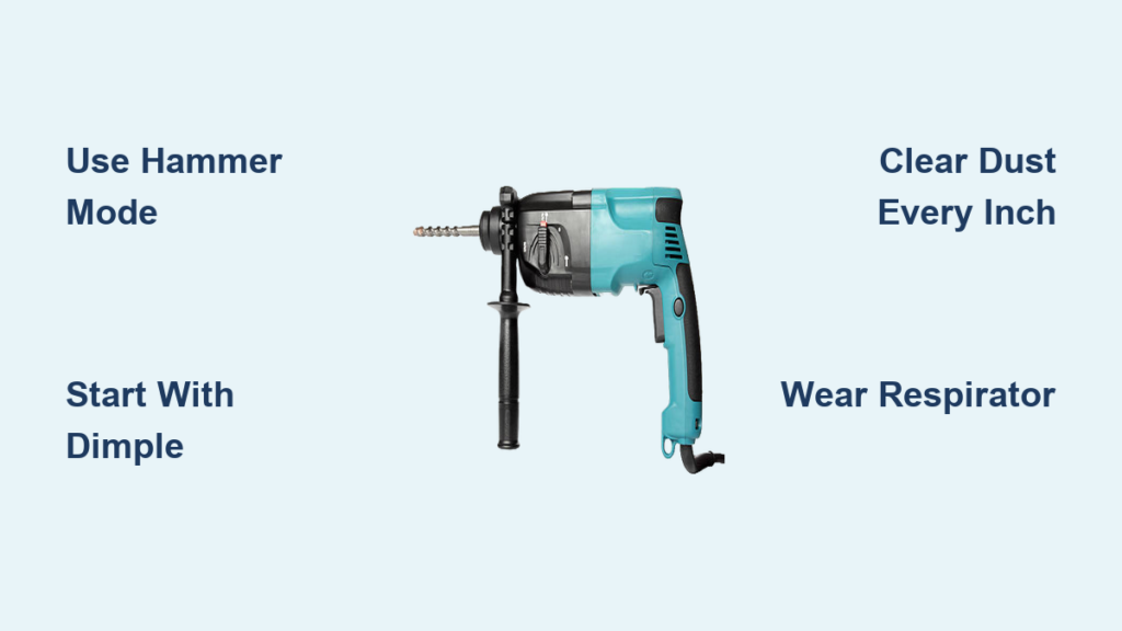 Hold the drill firmly with both hands, using the side handle for stability. Start at low speed (400-600 RPM) in hammer + drill mode (never “drill only” mode). Apply steady, moderate pressure—just enough to keep the bit engaged. Key indicators: